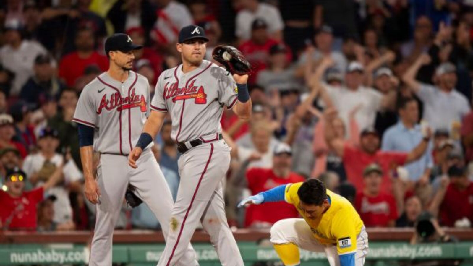 Center fielder Michael Harris II caught a shallow fly ball from Triston Casas and threw to first after Adam Duvall had strayed too far.