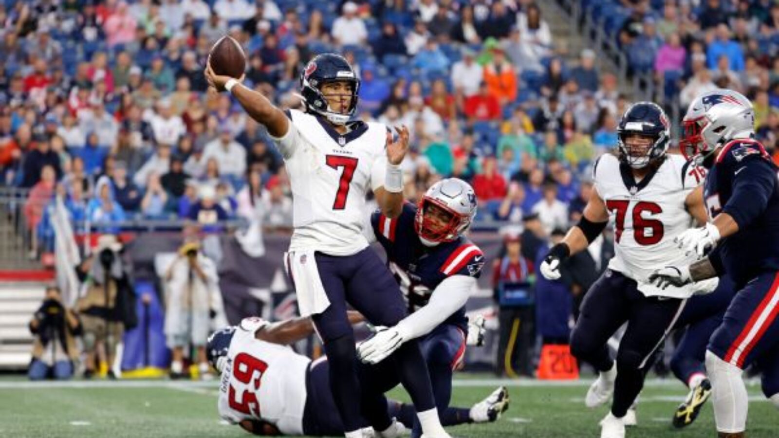 One reason for Stroud’s struggles was the duress he faced, as he was pressured on 60% of his five dropbacks. The game’s first play was a Stroud completion to wide receiver Nico Collins for 8 yards. But moments later, he was sacked by Patriots defensive tackle Daniel Ekuale, who was quickly in the Texans’ backfield.